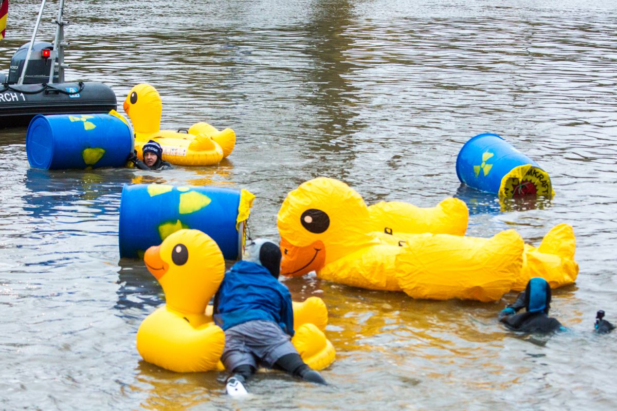Die fünf Castortransporte per Schiff im Juni, September, Oktober, November und Dezember 2017 wurden von zahlreichen Protestaktionen zu Lande und im Wasser begleitet: