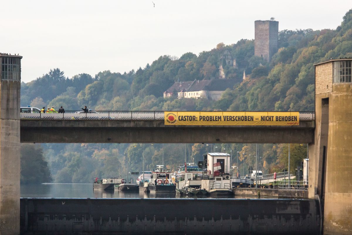 11. Oktober: Tag X (3/5)! Noch in der Dunkelheit der frühen Morgenstunden legt das Transportschiff ab in Richtung Neckarwestheim. Castorgegner*innen halten ab 8 Uhr morgens eine angemeldete Mahnwache in Gundelsheim. Weitere Protestaktionen laufen während des mehr als elfstündigen Transportes auf Brücken, an Schleusen und sogar im Wasser. SWR-Bericht