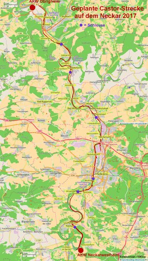17. Februar 2017: EnBW gibt bekannt, dass in nächster Zeit ein Probetransport mit drei leeren Castor-Behältern von Obrigheim nach Neckarwestheim schwimmen soll.
