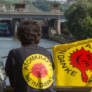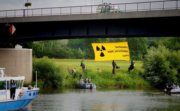 "Auf dem Neckar wird Atommüll verschifft. Aktivisten konnten den Transport kurz unterbrechen: indem sie sich von einer Brücke abseilten" (taz)