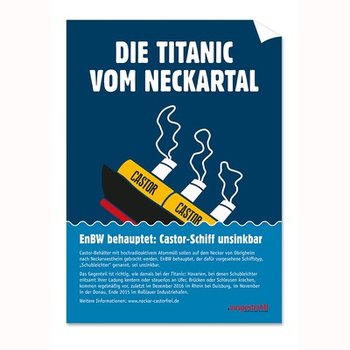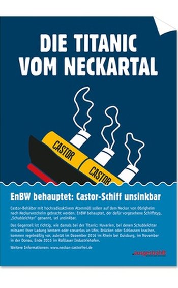 20. Februar 2017: .ausgestrahlt veröffentlicht das Plakat "Die Titanic vom Neckartal". Damit spielen wir auf die Aussage von EnBW-Kernkraft-Chef Jörg Michels an, der Schubleichter, mit dem die Castoren transportiert werden sollen, sei "unsinkbar". In der Realität gibt es regelmäßig Havarien.