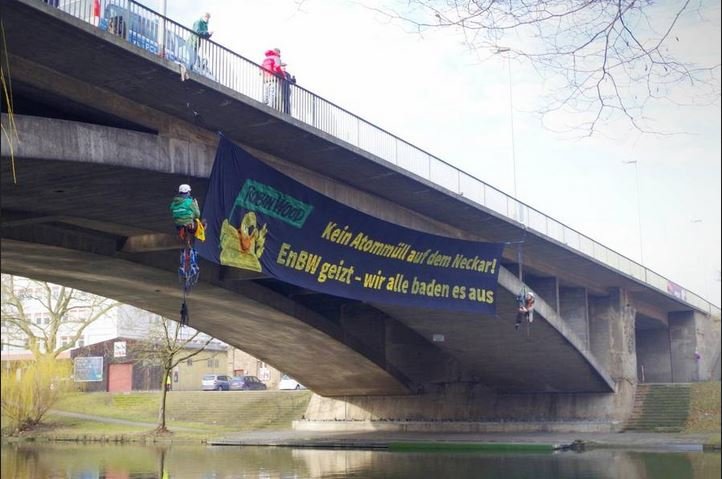 11. Februar 2017: Kletter-Aktivist*innen von Robin Wood hängen an einer Heilbronner Neckar-Brücke. Auf ihrem Banner steht: "Kein Atommüll auf dem Neckar! EnBW geizt – wir alle baden es aus."