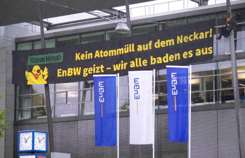 8. Mai 2017: Aktivist*innen von Robin Wood demonstrieren mit einem XXL-Banner an der EnBW-Zentrale in Karlsruhe - einen Tag vor der Hauptversammlung des Konzerns. Klare Message des Protestes: Sicherheit vor Wirtschaftlichkeit!