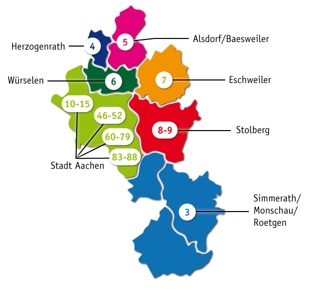 Die genaue Streckenaufteilung für die Aachener Stadtteile gibt es leider nicht als Karte. Du kannst sie der Strecken-Liste entnehmen: